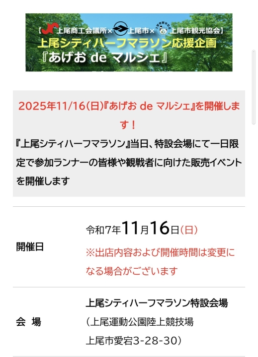 16日㈰上尾シティハーフマラソン『あげおdeマルシェ』