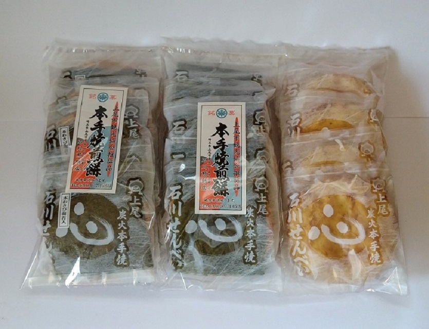 しょうゆ煎餅5枚入り、海苔煎餅5枚入り、わさび海苔煎餅5枚入り等あります。
